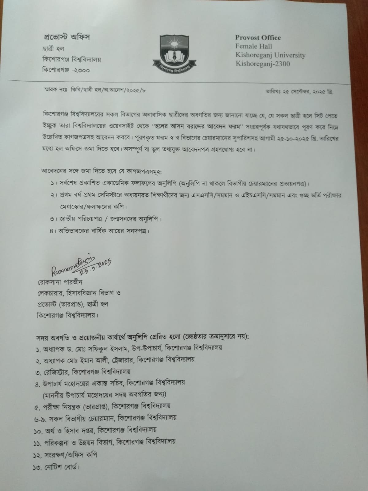 | 31 | 19 Jun 2025 | ছাত্রী হলে উঠার জন্য প্রয়োজনীয় ডকুমেন্টস জমাদান প্রসঙ্গে | General Notice | |